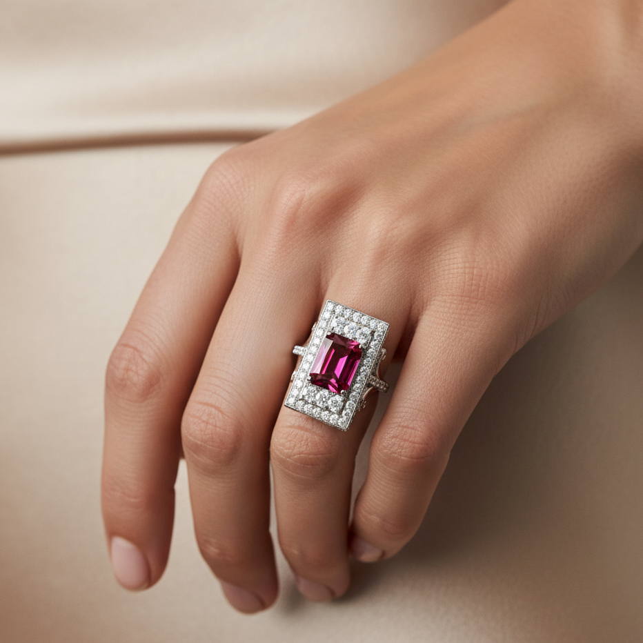 "Elegant and timeless, this handcrafted piece is made from high-quality Silver S925, featuring a stunning radium-plated finish for enhanced durability and brilliance. It is adorned with a premium American stone, showcasing impeccable craftsmanship and a flawless high-polish finish, ensuring a luxurious look that exudes sophistication."
